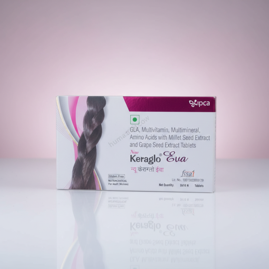 Keraglo Eva Tablets are specially formulated for women to promote healthy hair growth and prevent hair fall. These tablets are enriched with natural extracts, vitamins, and minerals that help nourish the scalp, strengthen hair follicles, and improve overall hair texture. They contain Gamma-Linolenic Acid (GLA) derived from evening primrose oil, which is essential for hair strength and scalp health. Regular use of Keraglo Eva supports thicker, shinier, and healthier hair.